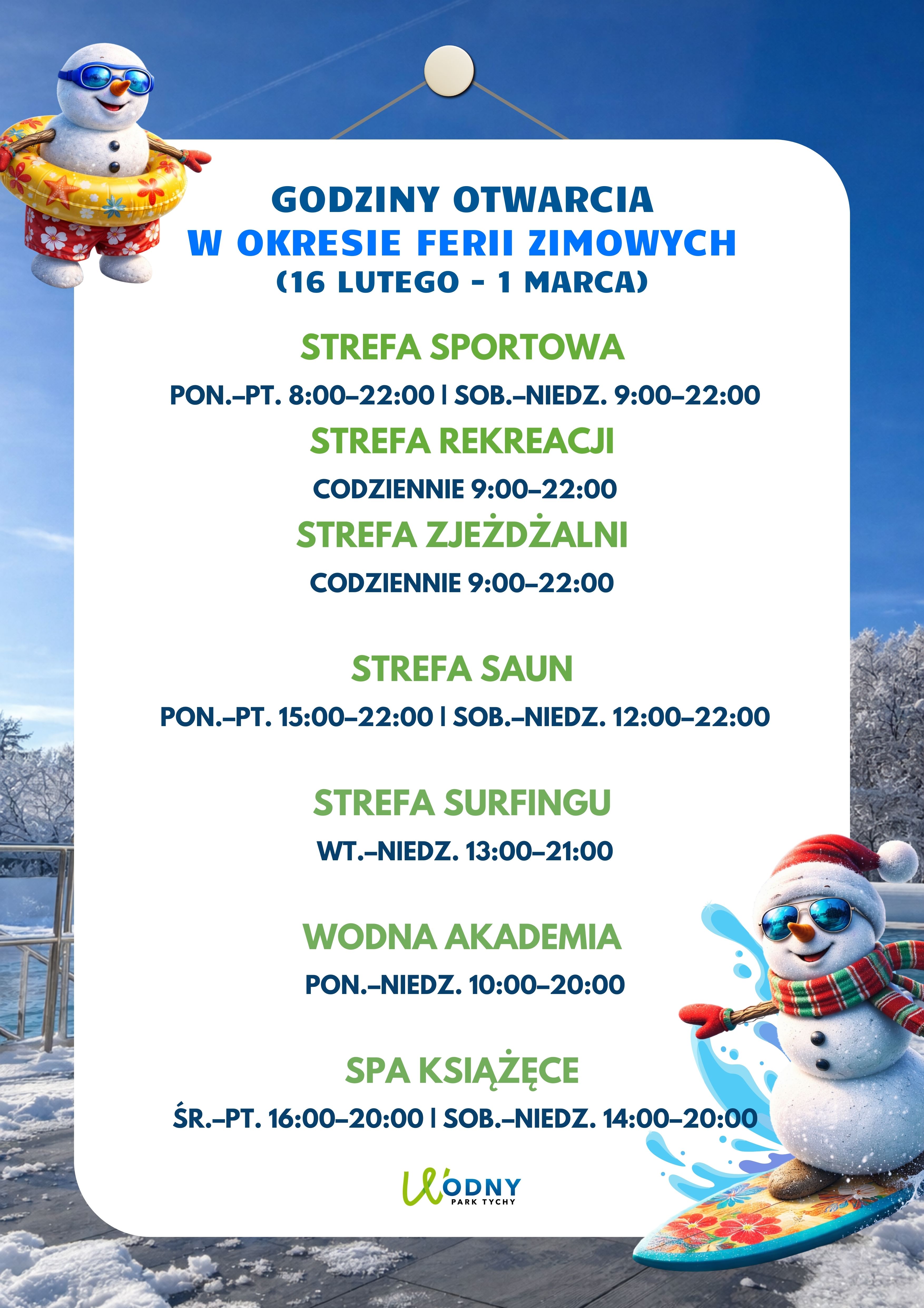 Zapraszamy przez całe ferie – niezależnie od tego, czy planujecie aktywny dzień w strefie sportowej, zabawę na zjeżdżalniach czy relaks w saunach 💙
